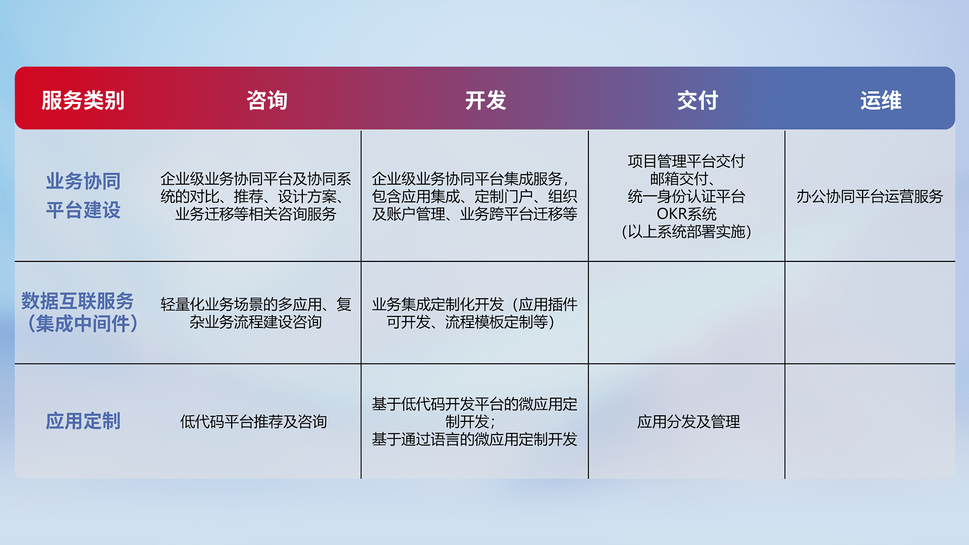 针对钉钉、、企微、、、、IDaas等平台级产品提供产品的规划、、、、方案、、交付、、、定制化开发等服务,,实现如统一协同办公、、智能客户服务、、混合会议管理、、、智能数据查询、、、等业务场景,,,实现数字化转型。。。。