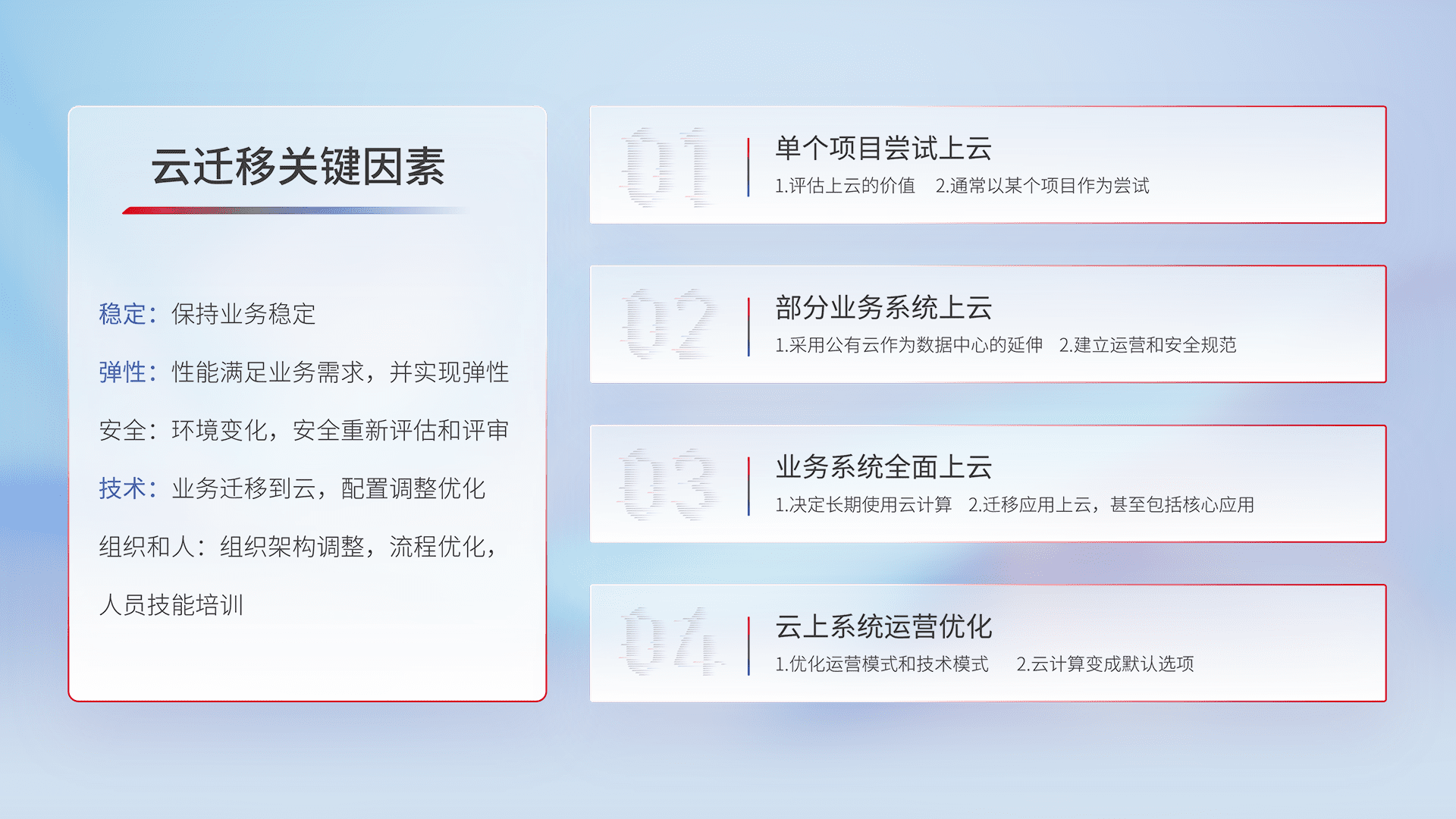 结合实际业务,,,,从规划设计、、、、云平台选型、、、、云原生改造、、、数据迁移、、、集成交付,,迁移全过程为客户识别最佳上云路径,,做好风险识别管理,,,,设计网络架构、、、身份权限、、、、安全审计合规、、、、操作审计、、、、日志审计、、、、监控告警策略、、、、多站点容灾设计等,,,,对云上基础设施进行整体规划,,,提升IT治理水平,,,以满足弹性、、、高可用、、高性能的需求。。。