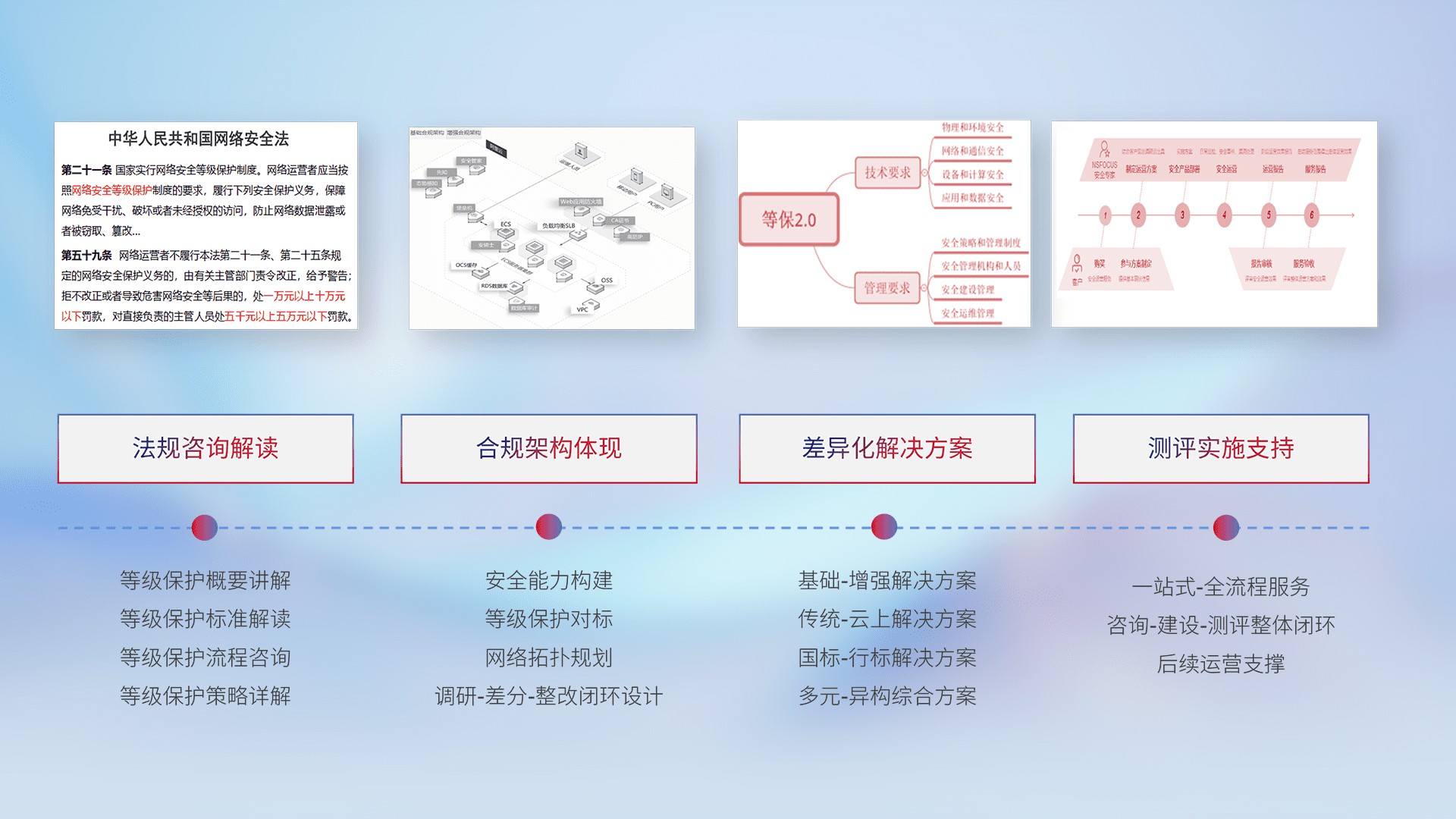 通过专业的法律咨询解读、、、合规架构体现、、差异化解决方案、、、、测试实施支持等服务,,,为客户量身打造等保合规体系。。。。